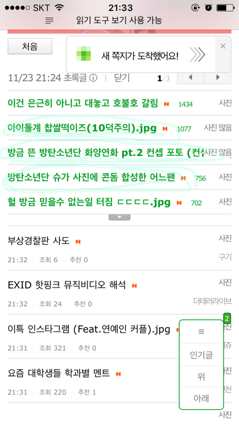 3개나 방탄이 장악..그중한개는 안좋은일이지만 그만큼 걱정가지고 관심가진다는거니까..난진짜 초록글에 일정아이덜글이 3개 이상 올라간걸 본적이 없음..무심코 활동하다가 봤는데 진짜 깜짝놀램