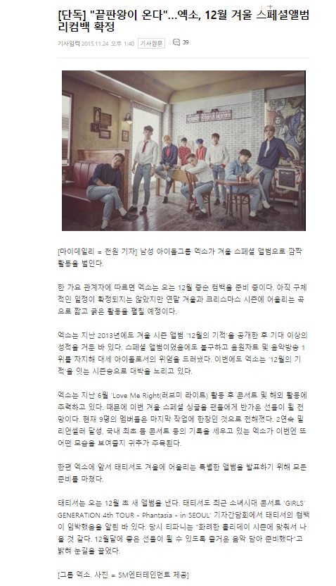 엑소 12월 겨울 스페셜앨범 컴백
