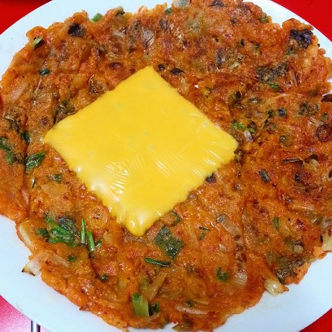 와이프가 치즈를 좋아해서 김치전에 슬라이드 치즈라도 올려봤습니다 ㅎㅎ