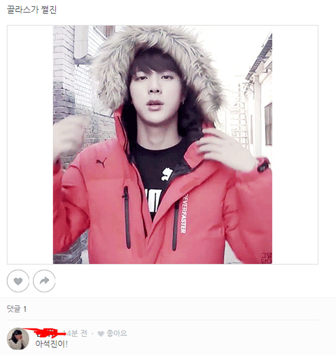 이건 추가 된건데 석진이 잘생긴짤 올리고 나서 몇분 안된담에 바로 아 석진이 하면서 말투에서 하트 나올 기세로 말하는거 있지 ㅎr....내가 진짜 우리 학교에있는 나포함 아미2명이랑 으뜨케 학교 생활을 하지.....