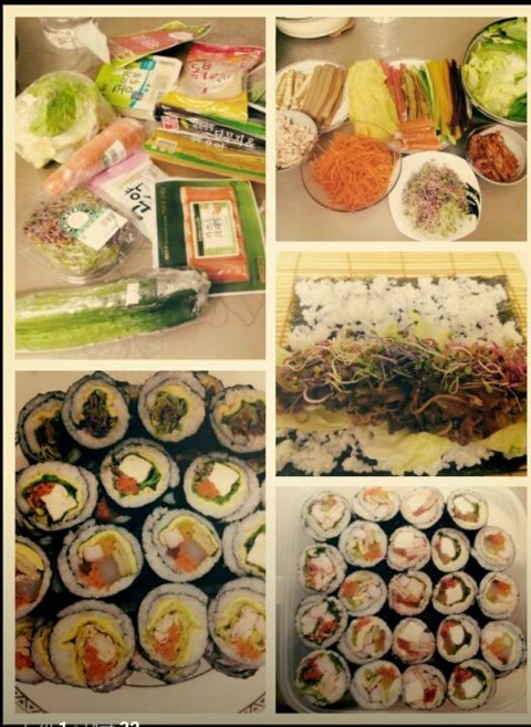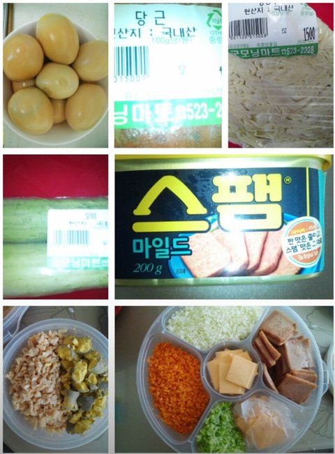 기계로 자른것아님. 양배추.당근.오이 다지고 스팸굽고.달걀로 밥통에 훈제로 만들어서 준비.