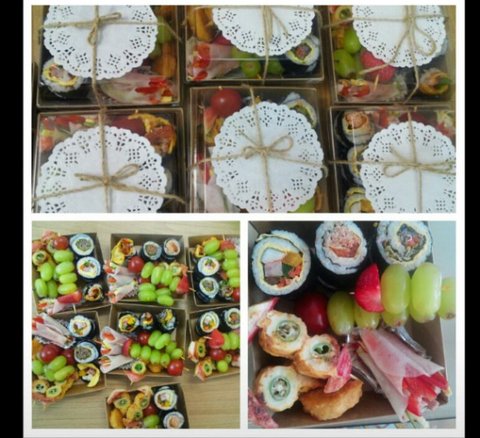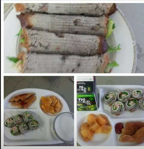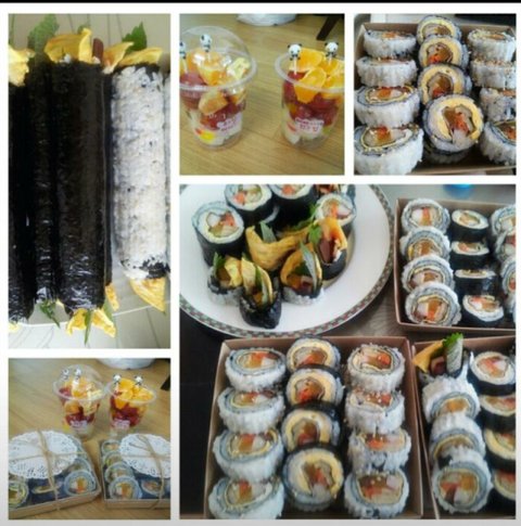 김밥.무쌈말이 과일.어묵고치(어묵안에 매운고추넣어썰어서 맛살이랑 꼬지에 끼워계란물입혀후라이팬에 부쳐준다) 매운거못드시는분은 안매운걸로.. 정여사는 청양초로