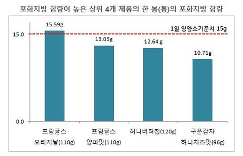 유통 중인 일반 제과류 제품 중 포장공간비율이 20%를 넘는 것으로 나타난 제품은 ‘구운감자’, ‘구운감자 허니치즈맛’, ‘프링글스 양파맛’, ‘프링글스 오리지날’로 나타났다.