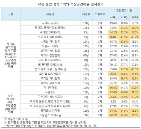 유통 중인 공기주입 방식(질소충전 봉지과자)제품 중 포장공간비율이 35%를 넘는 것으로 나타난 제품은 ‘레이즈 포테이토칩 클래식’, ‘수미칩 ORIGINAL', ‘수미칩 허니머스타드’, ‘스윙칩 허니밀크’, ‘칩 포테토 사워크림 어니언’, ‘포카칩 스윗치즈맛’, ‘포카칩 어니언맛’, ‘허니버터칩’으로 나타났다.
