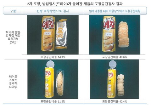 제과류의 포장공간 비율은 20%, 공기주입 방식(질소충전 봉지과자) 포장은 35%로 제한하고