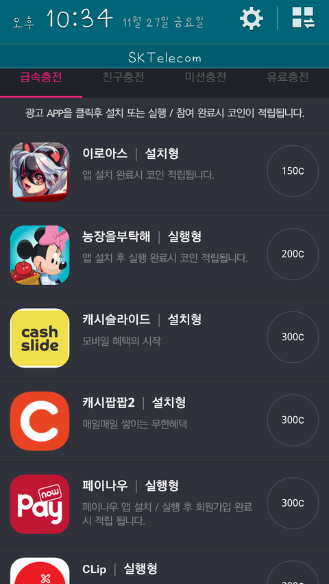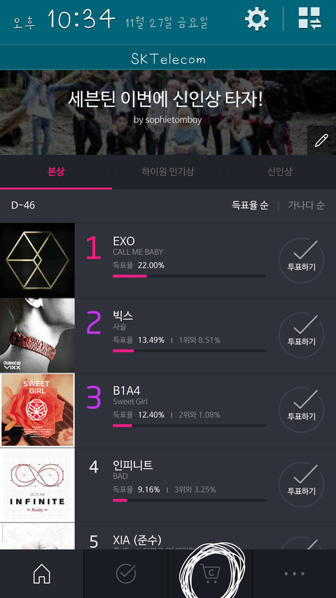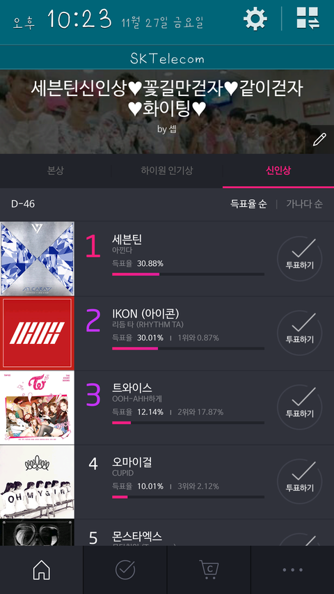 이렇게 뜹니다 번거로우시겠지만 설치만 하거나 설치해서 실행을 해야만 투표권을 얻어서 투표를 할수있어요ㅠㅅㅜ그리고 저기 미션충전이라는것도 있는데 거기서도 코인을 작게 벌수있으니 도전해보세요!