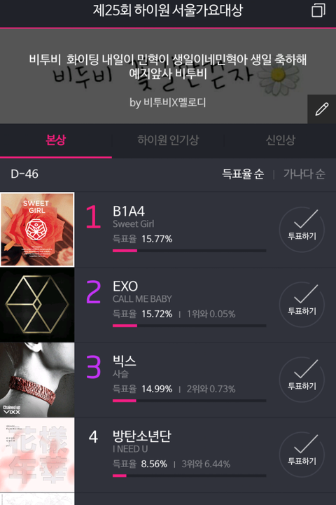 "서울가요대상"검색 제 25회 하이원 서울가요대상 투표 어플 다운로드 후 투표