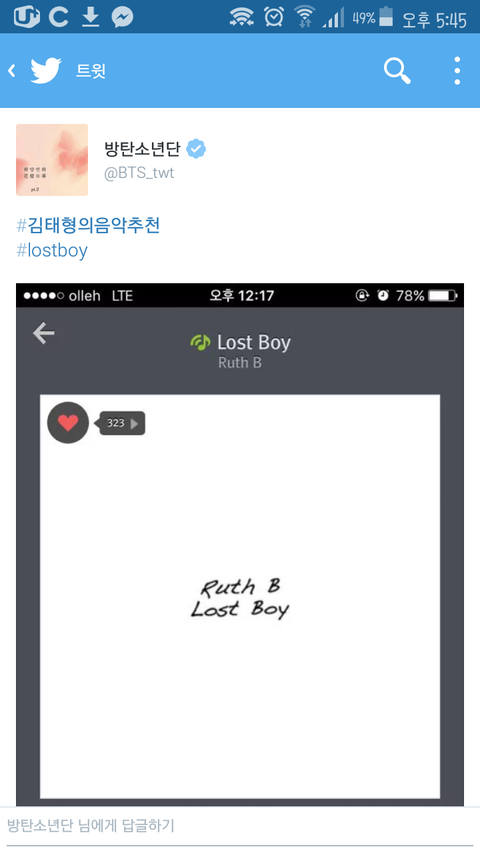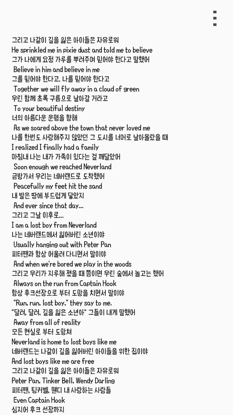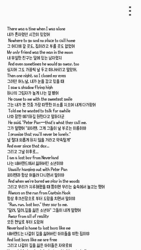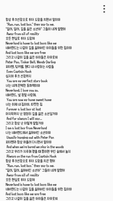 기억나?태형이가 트위터에 노래 추천한다고 Ruth B의 Lost boy추천 해줬잖아...예전에도 들으면서 피터팬?이러고 들었는데 티져도 나오고 궁예질도 하면서 갑자기 생각났는데...가사가 피터팬 관련 가사ㅇㅇ네이버에 뒤지니까 잘 않나오든데 블로그에서 퍼왔고 출처는 맨밑에 블로그에서 다 가져왔어 뒷북인지 모르는데 지금 그 노래 듣고 있는데 소름이라서 바로 올렷..