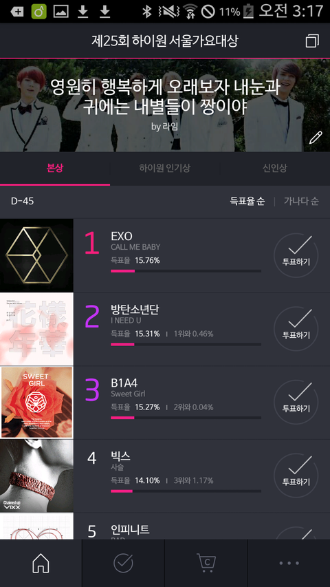 한시간마다 오르는 투표수 음원만 강직하면 되게따!