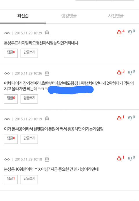 우리가본상 차이좀많이벌려놓은다음에 인기상총공하는게좋을거같아 적어도 인기상4위안에는들어가도록하자 이번주금요일정도까지 본상 40퍼센트찍어놓고 주말에 인기상 총공열심히해서 많이올리자