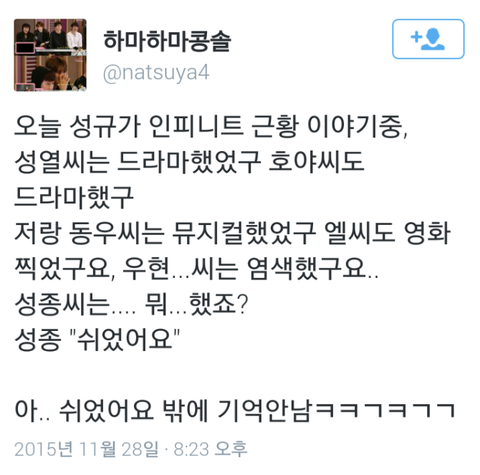 ㅋㅋㅋㅋㅋㄲ예전에그거생각난다 호야동우는 H로 인사드릴예정이고요.. 엘은 드라마로인사드릴예정이구요 성종성열은F로인사드릴예정이고요.. 하다가 성규가우현이보고 우현이는 그냥인사만드릴예정이고요ㅋㅋㅋㅋㅋ기ㅣㅣ