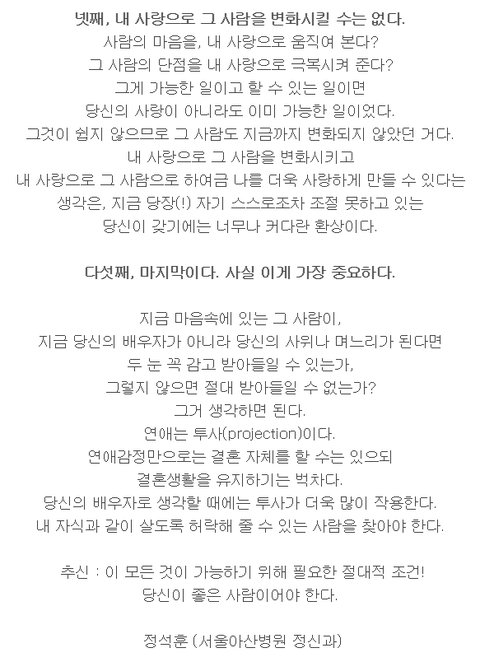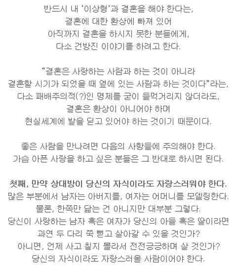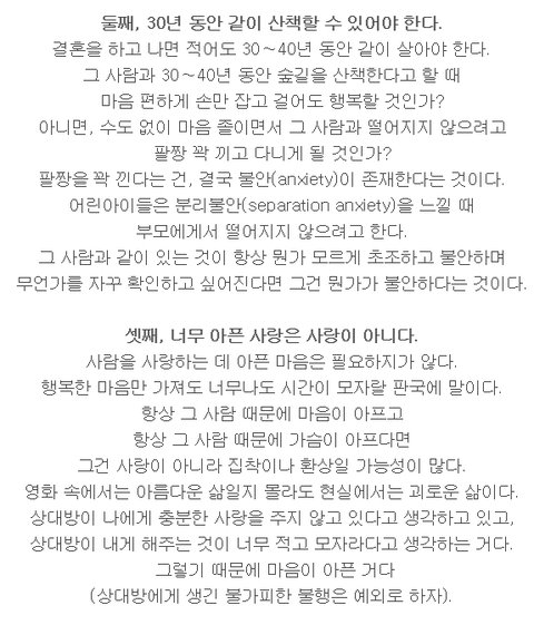 이 글을 읽고 나니 남편이 새삼 소중해지네요. 내 자식이어도, 내 사위여도 자랑스러울 사람이거든요. 둘이 손잡고 산책하는 것 외에는 재미있는 외부 활동을 즐기지 않는 사람이라 불만이었는데 손잡고 마음편히 산책할 수 있는 사람인 게 가장 중요한 것이었네요~.