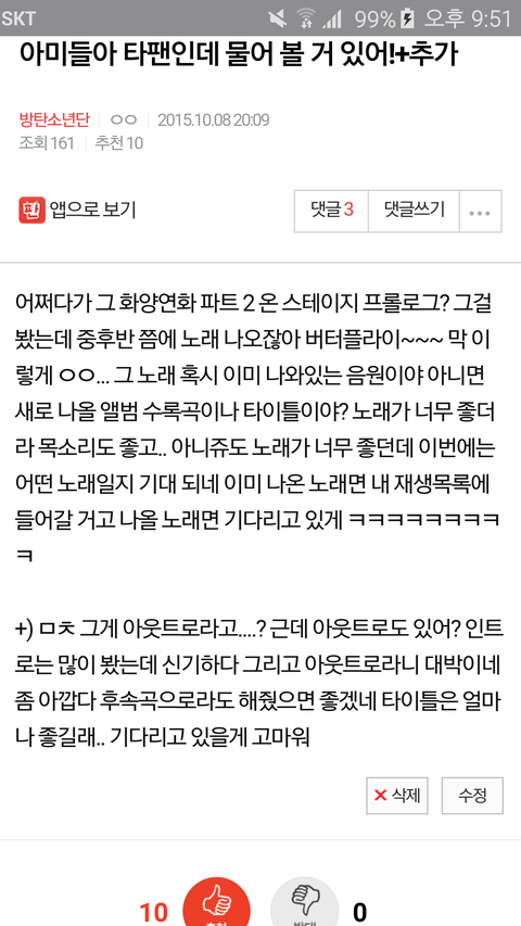 예전에 저런 글 썼었거든..? 트랙 리스트 며칠 전에 봤는데 수록곡이더라 아웃트로면 노래가 짧으니까 아쉬웠는데 그럼 랩까지 있겠네 정말 기대 많이 하고 있어 그리고 타이틀 곡 RUN도 그렇고!!! 사실 나 어 ㅂㅇㅂ거든...? 나 진짜 미안해가지고...ㅠㅠㅠㅠㅠㅠㅠㅠㅠ 정말 도배나 그런 거 ㅂㅇㅂ들이 그런 거 아니니까 오해 하지 말아줬으면 좋겠구 많이 응원해 버터플라이 진짜 내가 좋아하는 곡 스타일인데 크 방탄 명곡 진짜 많지 요즘에는 렛미노 잘 듣고 있어 오늘 자정 맞지? 방탄 더 크게 성장했으면 좋겠고 대현이랑 뷔 님 친해서 더 호감이야 아미들아 진짜 미안하고 컴백 잘 돼라 화이팅♡^♡ +그리고 ㅂㅇㅂ들이 진짜 미안해서 너네 거 스밍 같이 돌려줄려고 해 괜찮지..?