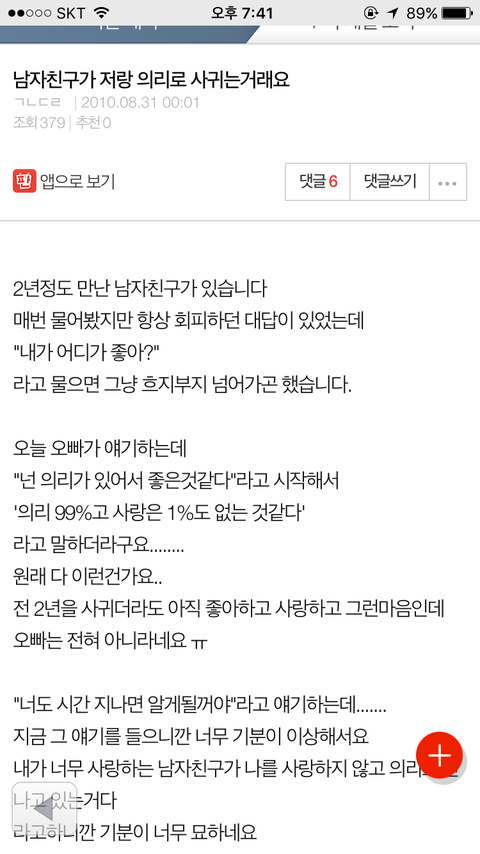그런데 이번 남자친구도 저를 너무 좋아하는데 사랑은 잘 모르겠데요. 이번이 처음이면 "나쁘다. 헤어지자는 말을 이렇게 돌려서해?"라고 생각할텐데 각각 다른 남자들 3명이 같은 얘길 하니까 혼란스럽네요. 2살 연상 오빠, 동갑, 그리고 지금 만나는 연하남자친구까지.