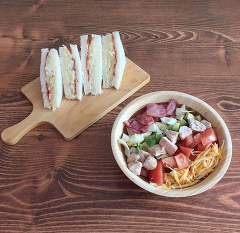 감자+계란 으깨서 마요네즈,소금,후추 간에 버무린 속으로 만든 샌드위치와 닭가슴살,토마토,베이컨,콜비잭치즈,삶은 달걀,아보카도,양상추 넣어 만든 콥샐러드 예요