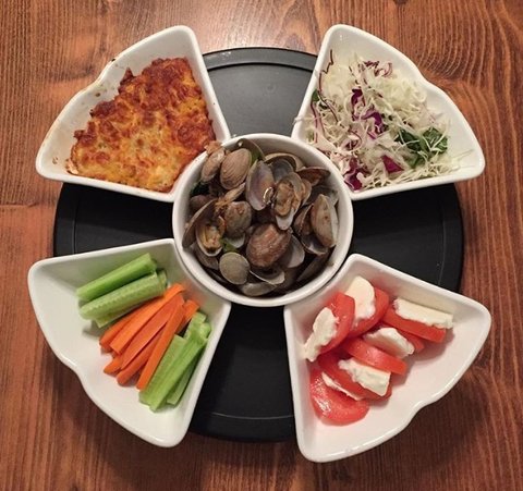 콘치즈에 피자치즈 뿌려 굽고, 양배추 샐러드, 오이랑 당근도 길게 썰어서 놓고, 카프레제를 좋아해서 제 위주로도 한접시ㅋㅋ 가운데는 바지락 볶음이에요~