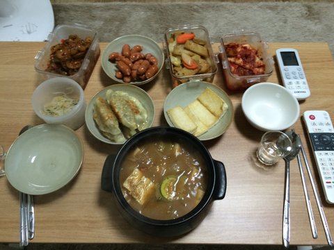 된장찌개를 베이스로 한 비비고만두와 두부부침 비엔나소세지 외 밑반찬들