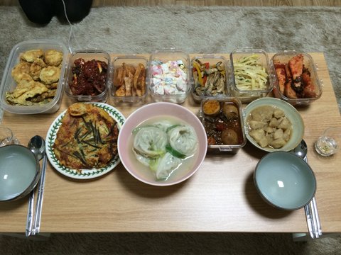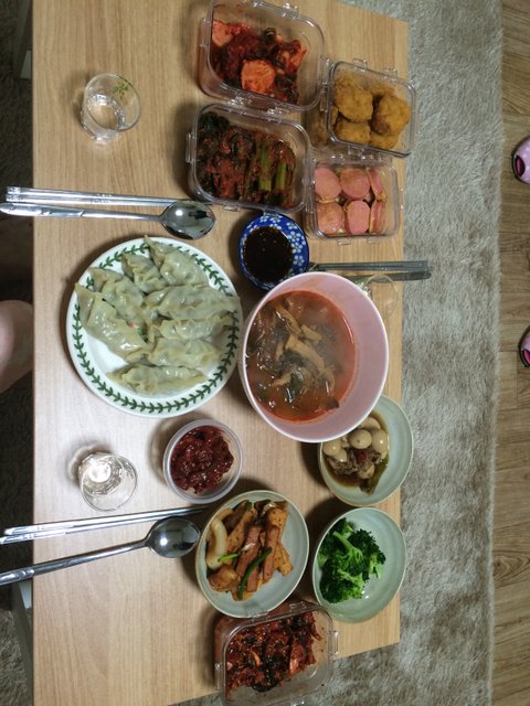 엄마가 끓여주신 사골국물에 왕만두 넣고, 부침개와 한잔꺽은날