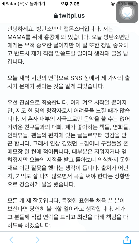 눈물나네.. 그래도 피드백 빨리 해줘서 고맙고 본인이 문제점을 깨달았으니 다시는 이런 일이 없으면 좋겠다 그분들한테 너의 진심이 닿았으면 좋겠다 남준아