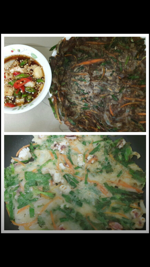도토리전.파전 (도토리가루를 고모가 갖다주셔서..부침가루에 부추.당근.양파 도토리가루넣어반죽해요..고소한게..쌉소름한게 맛나요..