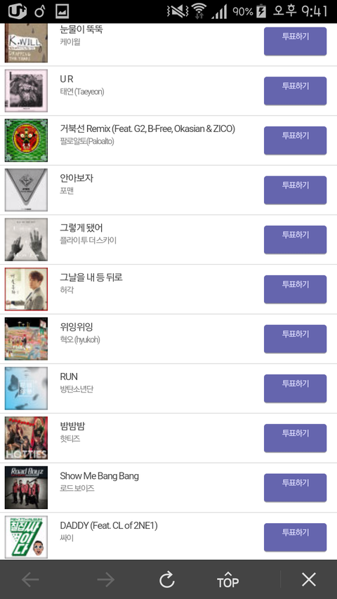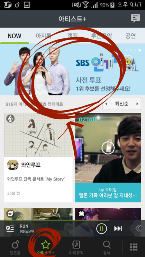 지금 멜롱 들어가서 밑에 별표(아티스트) 들어가서 인가 투표 눌러서 맨밑으로 가면 런있어 투표하자!!!!