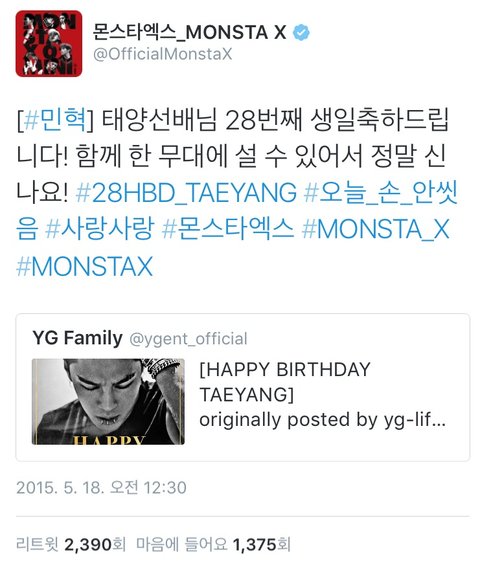 5월 14일에 데뷔해서 열심히 놬놬 무단침입하던 민혁은 데뷔 5일차 음방 무대에서 태양 선배님과 악수를 하게되는 영광을.. 손 안 씻겠다며 태그로 #오늘_손_안씻음 이라고 야무지게 ㅋㅋㅋㅋㅋㅋㅋ #28HBD_TAEYANG 으로 팬 인증 ㅋㅋㅋㅋ