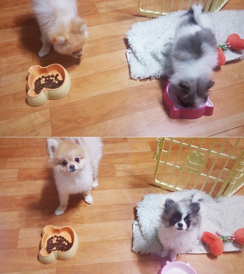 교육시키니 크림이 밥 주고 자기 밥 줄 때까지 얌전히 앉아서 기다려요
