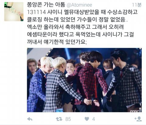 아쉬운 건 아쉬운 거고 본인이 연예인이고 보는 눈이 많은 만큼 말은 조심해야하지 않나요? 빅뱅 태양분의 저격아닌 저격으로 인해서 SM 가수 팬덤들, 특히 엑소엘, SM은 얼마나 이미지에 타격을 입었는 줄 아세요? 상도 못받는 인성 쓰레기로 취급됩니다. 네이버 기사 들어가보세요, SM 가수 쉴드 치는 댓글 얼마나 되던가요?