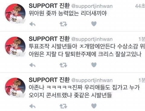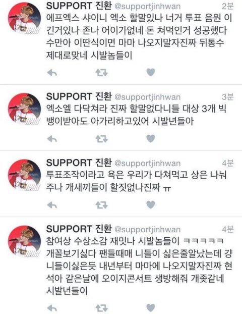 -support 진환이라는 YG 가수의 팬분 트위터에 올린 글. 일부의, 그러나 많은 YG 팬덤 분들께서 트위터에 많은 의견을 남겨주셨는데 글쓴이는 EXO의 팬으로서 이분의 발언이 가장 화가 났습니다. 자꾸 EXO 팬덤만 무개념으로 몰아가시길래 하도 어이가 없어서 그 예로 이분 트윗을 든 거고, 현재는 계정 탈퇴한 상태입니다.