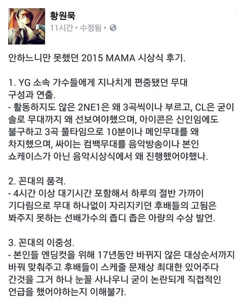 게다가 도대체 태양의 말 그 어느 부분에서 가수들이 아닌 엠넷을 저격하는 말로 들린다는 거죠? 애초 그 앞에 엠넷, 마마한테 감사한다고 말했고 함께하지 않으셨어요 라는 말은 가수들이 고의로 자리를 떴다는 얘기가 아닌가요? 도대체 어떻게 해석하면 그렇게 들리는거죠?
