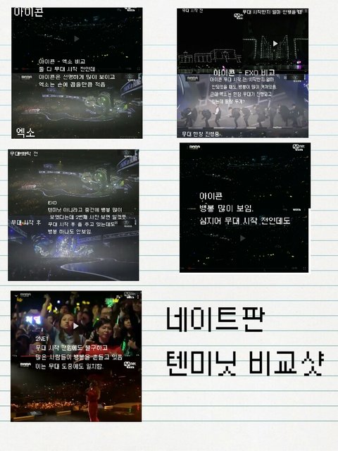 자꾸 아니라고 증거 날조하시길래 엑소는 가장 뱅봉이 많이 나온 사진, 투애니원 아이콘은 가장 적게 나온 사진으로 골라서 비교한 짤입니다.