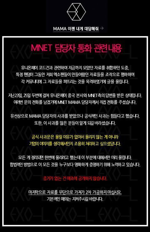 -엑소는 마마에 나온다고 확실하게 통지가 안되어서 팬들이 많이 참석하지 못했습니다. 그리고 팬들이 많이 못간게 그쪽분들이 텐미닛 하실 사유가 되나요?