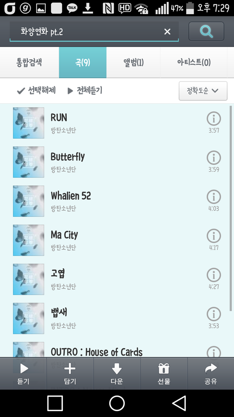 그다음에 전체선택 누르고 곡 추가하고 런만 따로 눌러서 따로 담기하고 현재재생목록 눌르면 되
