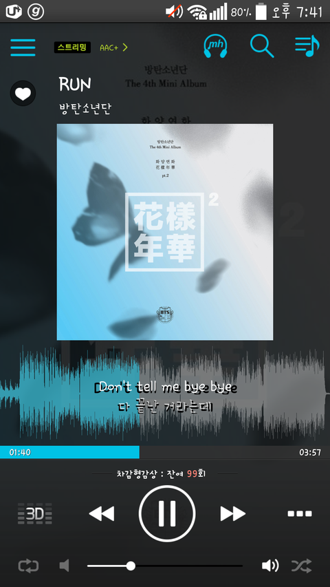 지니.. 화영연화파트2 검색해서 전체선택 한다음에 담기누르고 현재재생목록? 그거누르고 또 다시 런만 선택해서 담기누르고 현재재생목록 누르고 그냥 런 듣는중인데 스밍되는겨?
