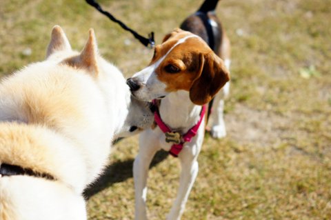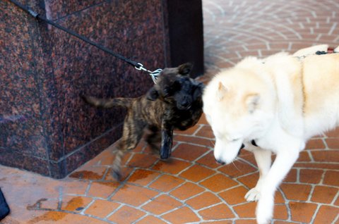 산책나와서 묶어있는 멍멍이 앞에서 킁킁 거리고 있는 심바.ㅋㅋ