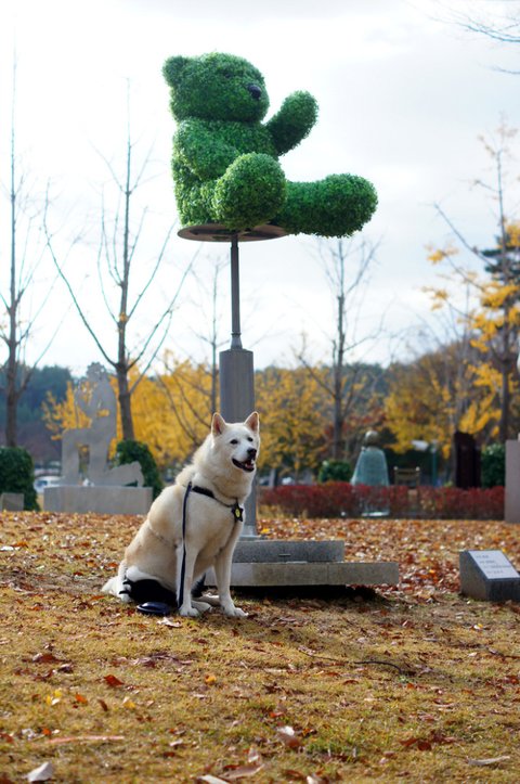 다음날 공원에 또 가서..ㅋㅋ 입구에 녹색 곰돌이 앞에서 사진찍었어요.