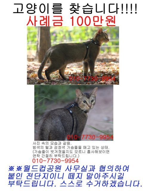 http://m.cafe.naver.com/ArticleRead.nhn?clubid=10070043&articleid=3778173&page=1&boardtype=L&menuid=50 댓글들 끝까지 보시면 마트 근처에 사무실이 있는 캣맘분이 아배붑으로 추정되는 냥이에게 캔을 주고 갔다는 말이 있어요.. 트위터에도 남겼는데 ㅜㅜ 아배붑인지 아닌지는 모르겠지만 혹시나하는 마음이 댓글 남깁니다.. 얼른 찾았으면 좋겠어요.... 철수씨 힘내세요