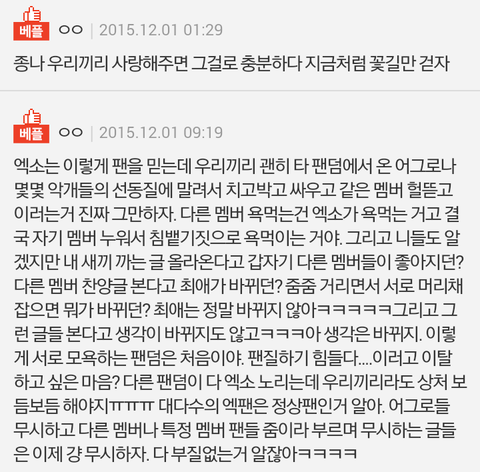 저기 지금 변백현 개인팬이 조카 난리치고 있는 거 같은데 걍 무시 해버려... 우리한테 더 중요한 건 따로 있잖아 그지? 8명 모두 잘생겼고 비율도 조카 좋고 옆동네 큰뱅이랑 비교하면 전혀 꿀리지 않는 애들인데 왜 잘난 애들끼리 자꾸 싸움붙일라 그래... 잘난 애들끼린 붙어봐야 끝 안나는거 알면서 ><