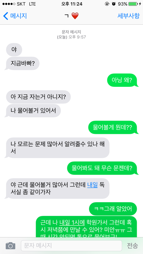 대박이야ㅠㅠㅠㅠ 다들 댓글 고마워 덕분에 내일 짝남이랑 만난다!!!! 할렐루야ㅠㅠㅠㅠㅠㅠ 나년 벌써부터 김칫국드링킹 중이지만 ..그래도 너무 좋다ㅠㅠ❤️❤️ 밑에는 문자내용이야! 사실 저거 보내면서 저기선 아무렇지 않은척해도 현실에선 베개뜯고 난리났었어 그러다 엄마한테 욕먹고 혼자 설레 죽을뻔함ㅠㅠ