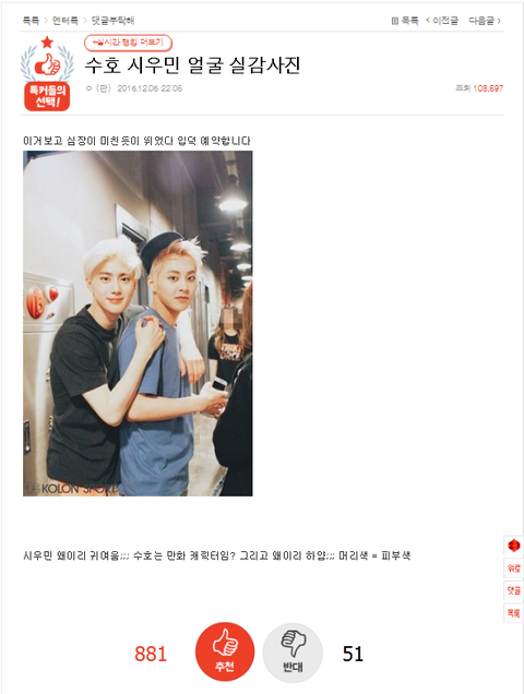 수호랑 같이 얼굴 실감사진이라는 글 올라왔어 지금 보고 캡쳐해 옴 링크도 가져왔어 민석이 이쁜 짤도 같이 올려주자 >.<