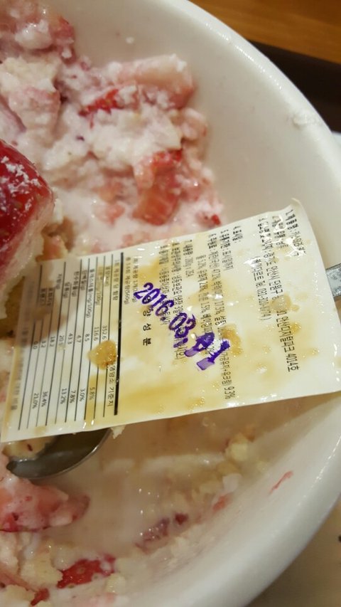 안녕 판처음써봐ㅋㅋㅋㅋㅋ내가 내일이 시험이라 친구랑 같이 공부할려고 설빙에갔거든?ㅋㅋㅋㅋㅋ정작 공부는 안하고 먹기만했지.. 가서 친구가 한딸기설빙맛있대라고해서 어그럼 먹을까?하고 시켜먹은거야 ㅋㅋㅋㅋㅋㅋ맛있다맛있다거리면서 먹는데 막 그릇정가운데에 어떤 네모난종이가 있길래 친구랑 나는 어..이거 혹시 당첨or꽝종인가??싶어서 신나게 그걸 떼볼려했는데 처음엔 안떼지고 계속긁으면서 떼니까 떼졌거든ㅋㅋㅋㅋ근데보니까 밑에깔린 카스테라빵에있는 뭐랄까.. 옷을사면 막 면 몇프로 몇사이즈 이렇게 써져있는 종이있잖아?이게 그 아래에 깔린거야ㅋㅋㅋㅋㅋ진짜 친구랑 나랑 벙쪄서 뭐지..?싶었지 그래서 친구한테 야야 빨리사진찍어 이러고 찍고 나는 숟가락에 그종이 눕혀서 카운터언니한테가서 저기.. 이거 원래있는거에요?ㅋㅋㅋㅋ이랬는데 그 언니가 어라..?거리시면서 주방아줌마를데려오는거야 그러면서 진짜 죄송하다고 저희가 이걸 확인을 못했다고 그래서 ㅋㅋㅋㅋ난 그냥 아..아녜요 괜찮아요 ㅎㅎ..이러고 끝냈지 나보고 착한손님이래 내가 자리로 가니까 친구가 뭐안준대? 이래서 나도 뭐줄줄알고 간거였는데 안주니까 안주던데..?원래주는거아닌가? 이랬지 그때그냥 따질걸그랬나..?ㅋㅋㅋㅋㅋ