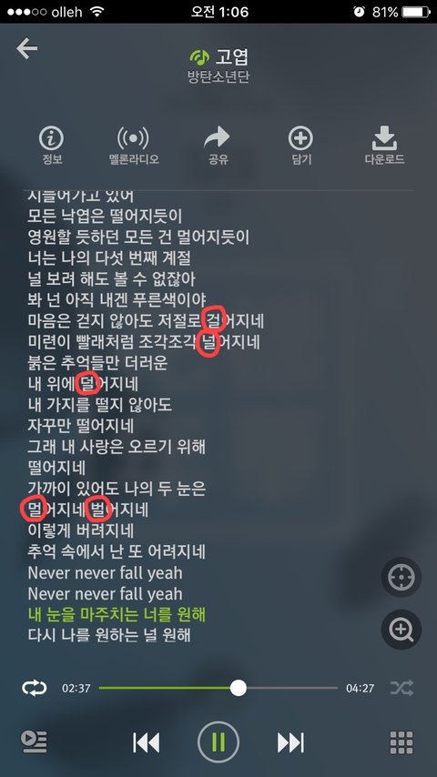 내님들 고엽에서 남준이가사에 개쩌는거있는거암?