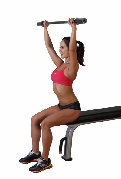 의자에 앉아서 등을 등받이에 밀착시킨다(등받이가 있는 경우). 양손을 어깨너비로 벌려 오버핸드 그립으로 바를 잡고 바벨을 머리 위로 들어 올린다. 숨을 들이쉬면서 손이 어깨높이에 올 때까지 바벨을 천천히 얼굴 앞으로 내린다. 숨을 내쉬면서 바벨을 다시 머리 위로 밀어 올린다.