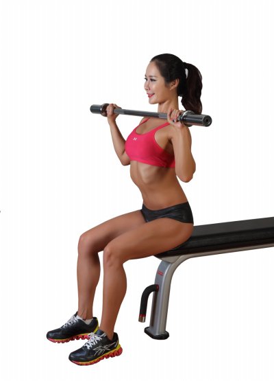 # 주의사항: 이 운동을 할 때는 등을 꼿꼿이 펴 등받이에 붙여야 한다. 바벨을 들 때는 반동을 이용하지 않도록 한다.
