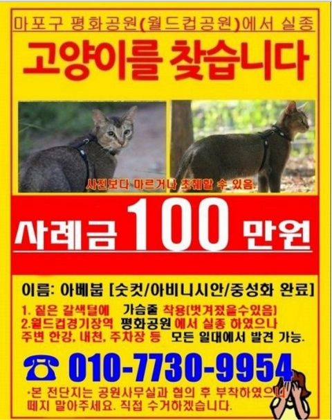 우선 이 댓글은 진심으로 아배붑을 걱정하고 꼭 찾길 바라는 마음에서 씁니다. 저도 고양이를 키우는 입장에서, 정말 걱정이 되네요. 고양이는 영역동물이기 때문에 산책을 나가게 되면 그 구역이 자기의 영역이라는 인식을 갖게 됩니다. 자기 영역을 지키기 위해 한번씩 순찰을 돌아요. 특정한 지역에 특정 고양이들만 나타나는건 이 이유때문이에요. 그게 그들의 구역이기 때문이죠 그렇기때문에 집고양이들은 애초에 산책을 시키는게 좋지 않습니다. 자기의 구역을 순찰하려고 집을 나가는 행동을 하게 되고, 다시 돌아오면 더할 나위없이 좋죠. 하지만 그 구역에 원래 그 구역을 차지한 고양이가 있다면? 집고양이들은 주인의 보호아래 자랐기때문에 사냥이나 전투에 능하지 않죠 그 구역의 원래 주인이 있거나 다른 곳에서 온 고양이와 싸움이 붙게되면 질 가능성이 높고, 싸음에서 지게된다면 그 구역으로는 다시 돌아올 수 없습니다. 이게 한번 고양이를 잃어버리면 찾기 어려운 이유예요. 고양이를 키우시는 분들은 아실거에요 집에서만 길러진 고양이들은 사람이 문을 열때 기웃기웃하긴 하지만 막상 나가라고 열어놔도 기웃기웃 밖만 살펴볼 뿐 나가지 않아요 자기 구역이 아니기때문에 안전하다는 인식이 없어서그렇습니다. 주인 입장에선 가출이지만, 고양이 입장에선 내 구역이 잘 있나 침입자는 없나 확인하는 당연한 과정입니다. 또한, 요즘은 고양이에 대한 인식이 많이 바뀌었다지만, 지금도 어른들은 고양이를 별로 좋아하지 않는분들이 많죠. 길에 돌아다니는 고양이를 보거나 동네에 눌러앉은 고양이를 보고 쫓아내거나 심한경우 학대하는 분들이 생각보다 적지 않습니다. 일부러 음식에 독을 넣어 죽이는 사람도 있고 막대기같은걸로 때리거나 심지어 찔러 죽이는 사람도 있어요. 보통 길고양이들은 사람에 대한 경계가 심하기 때문에 이리저리 잘 피해다니지만, 집고양이들은 사람을 위협적으로 느껴본 적이 없기때문에 사람에 대한 경계가 심하지 않습니다. 주인만큼 따르진 않아도 낯선사람을 피해다닐 정도는 아닌 고양이들이 많죠. 이렇기 때문에 길로 나가게 된다면 학대를 당할 가능성이 보통 길고양이보다 높습니다. 경계를 하지 않기 때문에요. 이러한 이유로 집고양이의 산책을 권장하지 않습니다. (사실 철수님께서도 이걸 모르신다고 생각하진 않으나, 내가 조심하면 되지 하는 생각을 무의식중에 하게 되더라고요.) (스트레스의 이유도 있습니다만, 이건 해당사항이 없는 고양이도 있으니 언급하지 않겠습니다.) 철수님도 이 문제에 대해 깊이 생각해보시고, 아배붑이 돌아오면 안전한 공간에서 아배붑과 들꽃과 행복하게 사셨으면 좋겠습니다. 아배붑을 꼭 찾으시길 바랍니다.