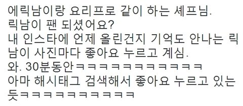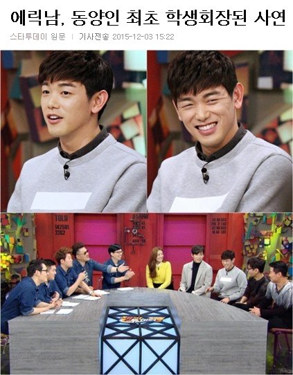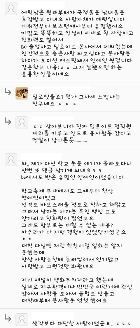 8살짜리 남자애가 미역국 끓인다고 부엌에 있을때 어머니가 말리지 않고 그대로 두셨을 때부터 에릭남은 지금처럼 자랐을 사람일듯 ===================================== 이 부분 완전 공감합니다. 어머니가 미인이실 뿐만 아니라 인상부터가..ㄷㄷㄷ 정말 좋은 가정에서 교육 잘 받고 사랑 듬뿍 자란 느낌이 나요. 동생도 콜롬비아 대학교 아이비리그 들어갔다던데 밥 안드셔도 배부르실듯 해요..