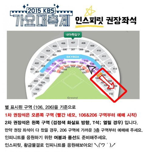 106,206번부터야!티켓팅할때 좌석 잘보고 권장석인 106,206번부터 꼭 티켓팅해 106,206 다차면 꼭 107,108,109,110,207,208,209구역 잡고