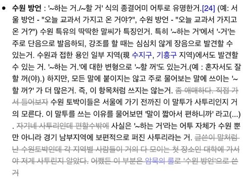 나도 수원사는 수원토박이인데 다른지역사는 대학교친구가 귀척하느라 그렇게 말하는줄알았다고 해서 놀랬던적이있음. 걍 이거먹을꺼? 이따먹을꺼 내일만날꺼 등등 걍아무렇지않게 썼었는데 사투리인지도 몰랐었음ㅋㅋㅋㅋㅋ