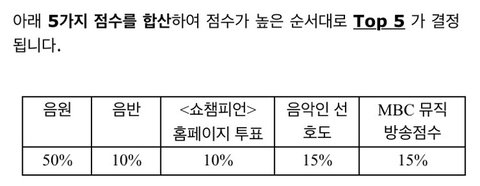 이렇게 합산해서 하는건데 음원이 50%임... 우리 음원 약한거 알지ㅠㅠㅠㅠ 진짜 스밍 빡시게 돌려야돼여 물론 투표도 열심히 해야되고 화이팅하자!!