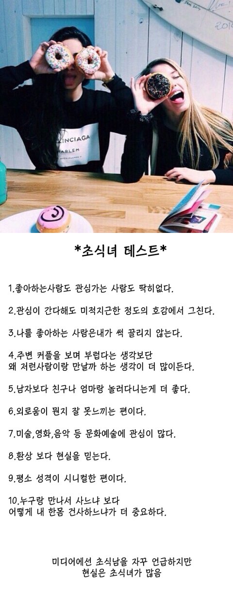 현실은 초식녀는 그냥 별로인 남자들한테밖에 대시를 못받아서 설렐일이 없는거임. 한 마디로 본인능력에 비해 눈이 높다는거지. 사실상 여자가 가장 예쁜고 아름다울 20대 초반에 나이에, 본인이 연애 못하는걸 합리화 시키기 위해 다른 연애하는 여자들보고 왜 저런애랑 사귀지 이런 생각이나 하면서 본인이랑 급을 나누는데 참...안타깝다. 인생에 가장 예쁠나이에 그래도 사랑도 해보고 연애의 달달함도 맛봐야할텐데 쓸데없이 눈만 높아서..
